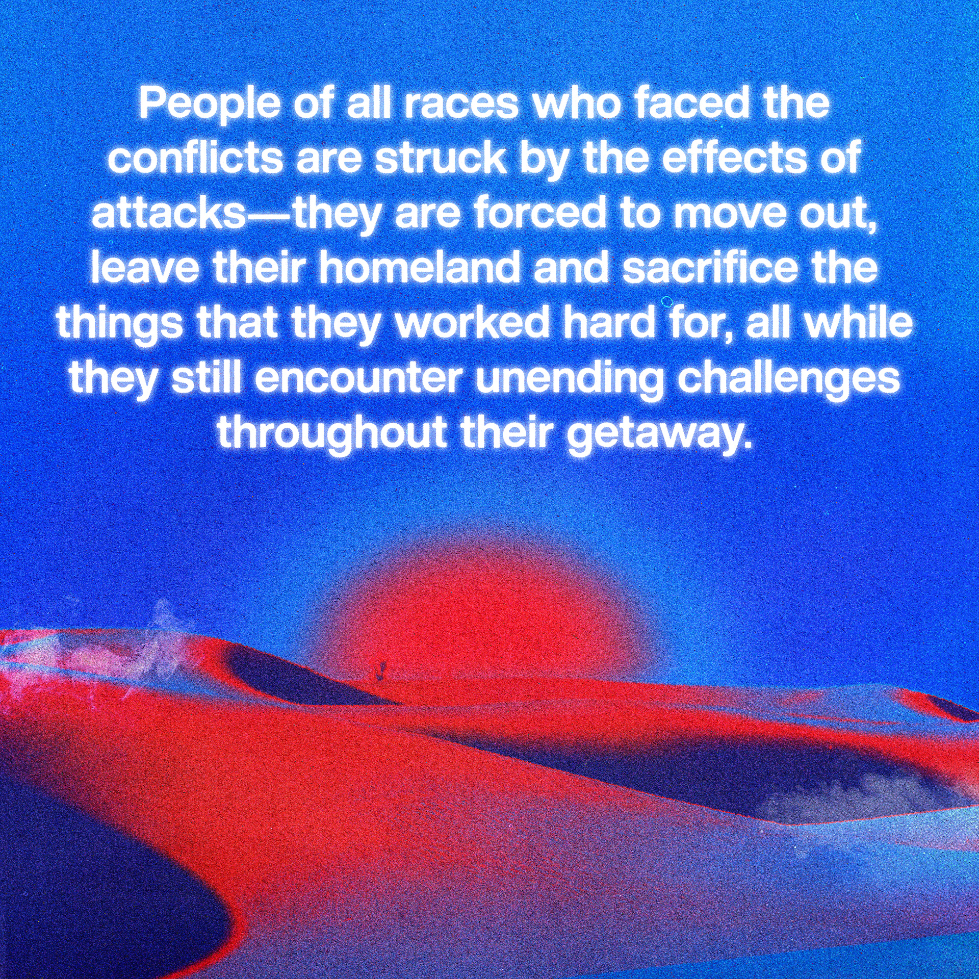 The digital collage showcases the form of migration that happened during the recent years of war. Through symbolism, I wanted to give a message that there are millions of innocent people who have been driven away from their homeland because of the actions of those who are in power.
